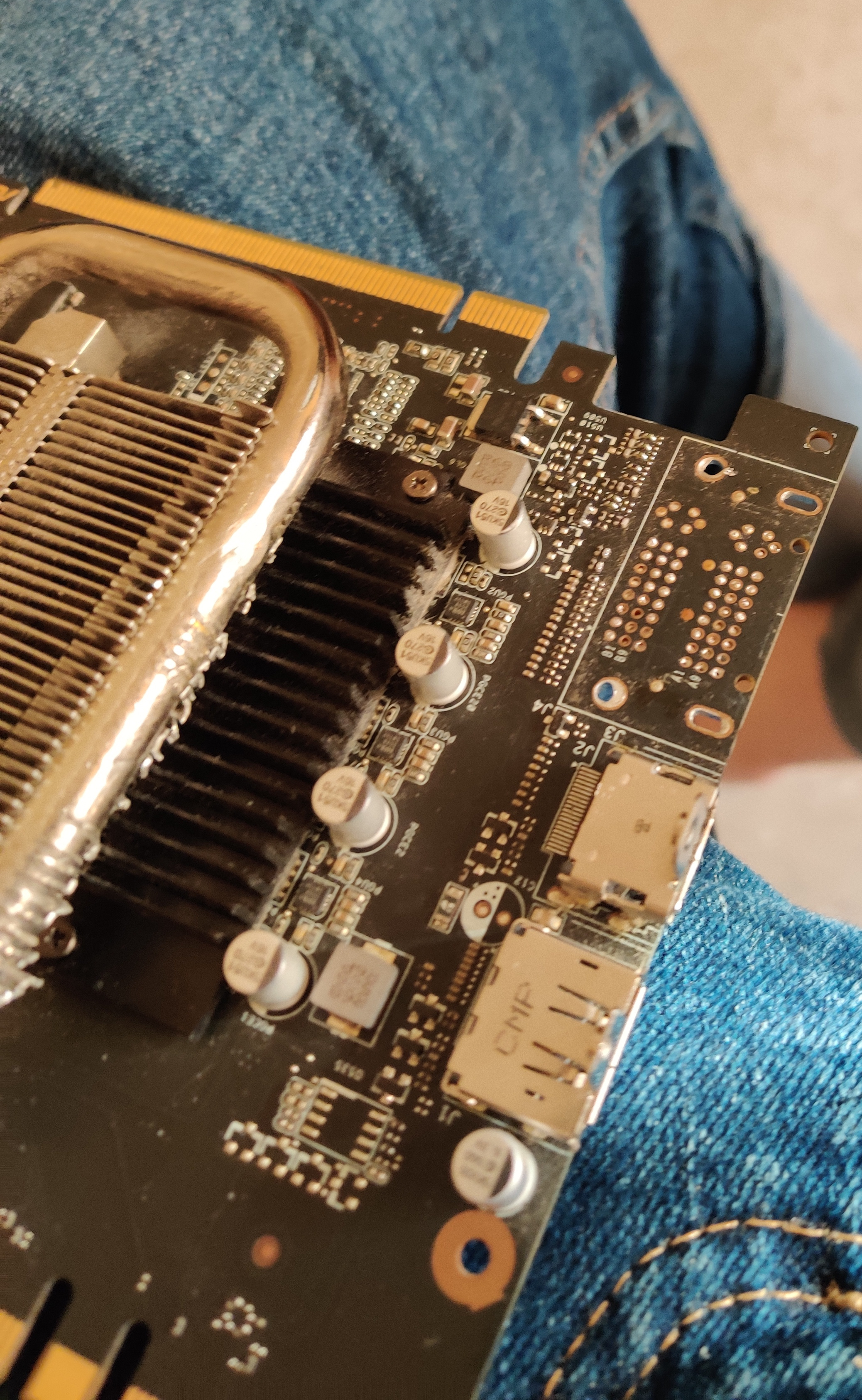 While I was waiting for the pcb to arrive/while I was designing, I started the process of removing the connector from the gpu. I first attempted to using a solder sucker and a quality solder iron, this turned out to be a bad decision due the multi layer design of basically all gpus (too much heat is required and too easy to disipate the heat). This basically meant that sucking would never work properly. I also tried using solder wick but I found it to not work not that great either (though I could be just a novice at using solder wick as I only recently started using it after finding a brand that was not horrible).
