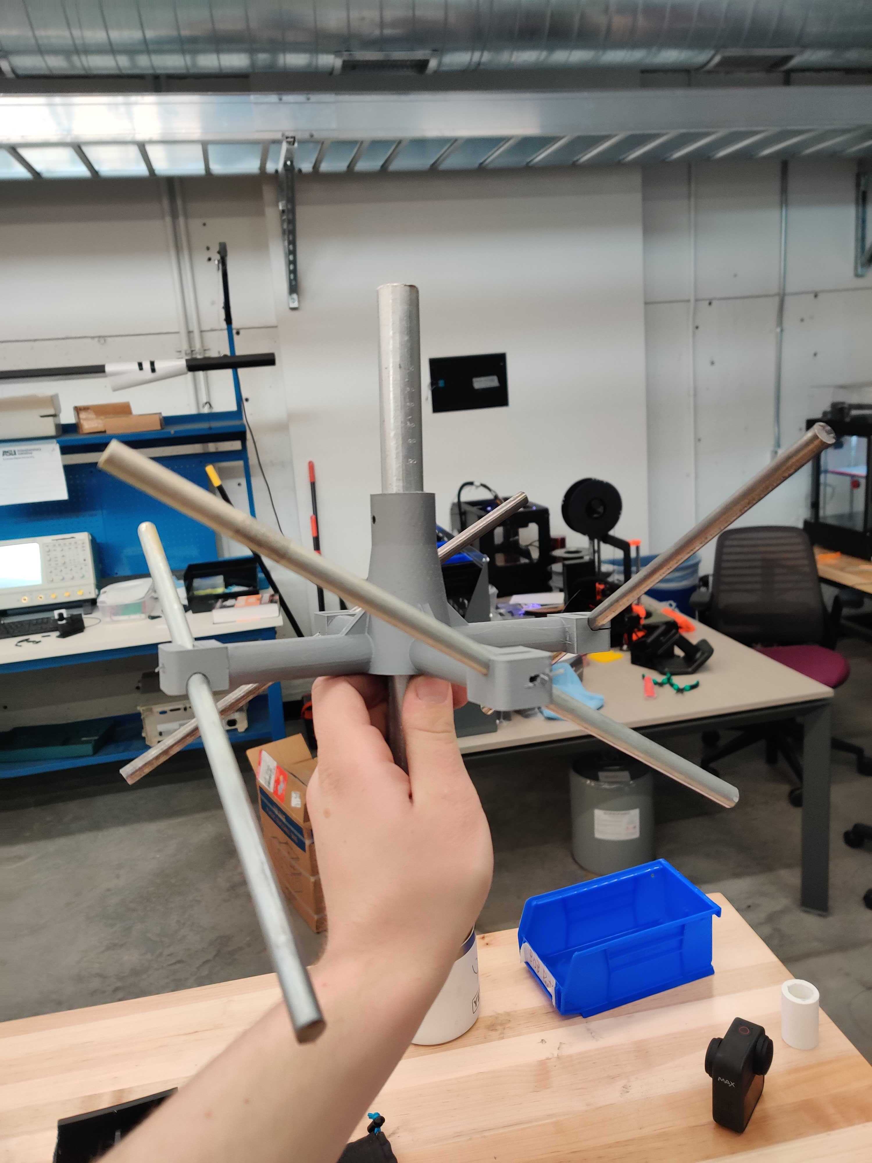 This Steel Variant technically worked but was not ideal bc of the material selection (low conductivity, can rust, etc). So a second attempt at making the antenna was made using the original aluminum plans.